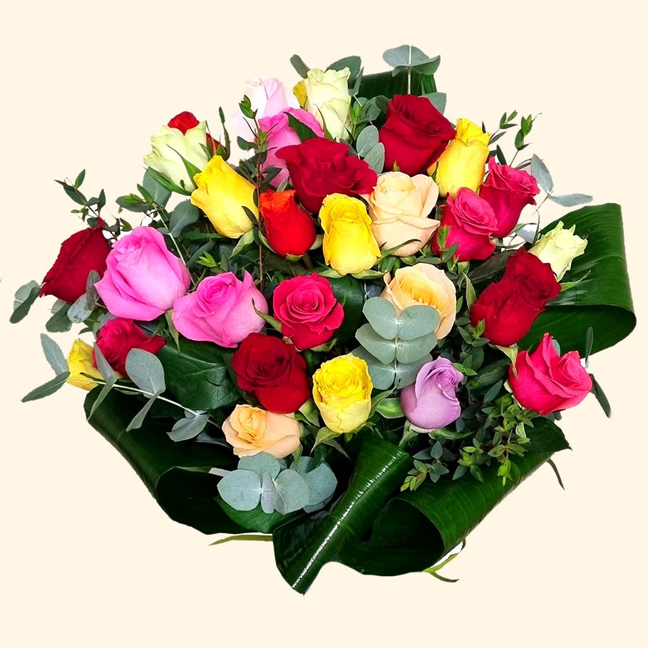 Bouquet di 30 Rose di colori misti con verde decorativo.