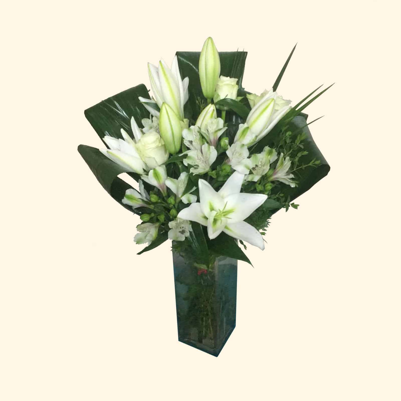 Bouquet bianco di Lilium. Bianco puro per questo bouquet di fiori di Lilium, Rose e Alstroemeria. Un’esplosione di candore e profumi di fiori bianchi, molto raffinato e classico nella sua composizione. Regalatelo a una giovane mamma in occasione di una nascita, o alla mamma per la sua festa, o ancora ad un’amica per il compleanno, e la felicità di chi lo riceverà è assicurata.
