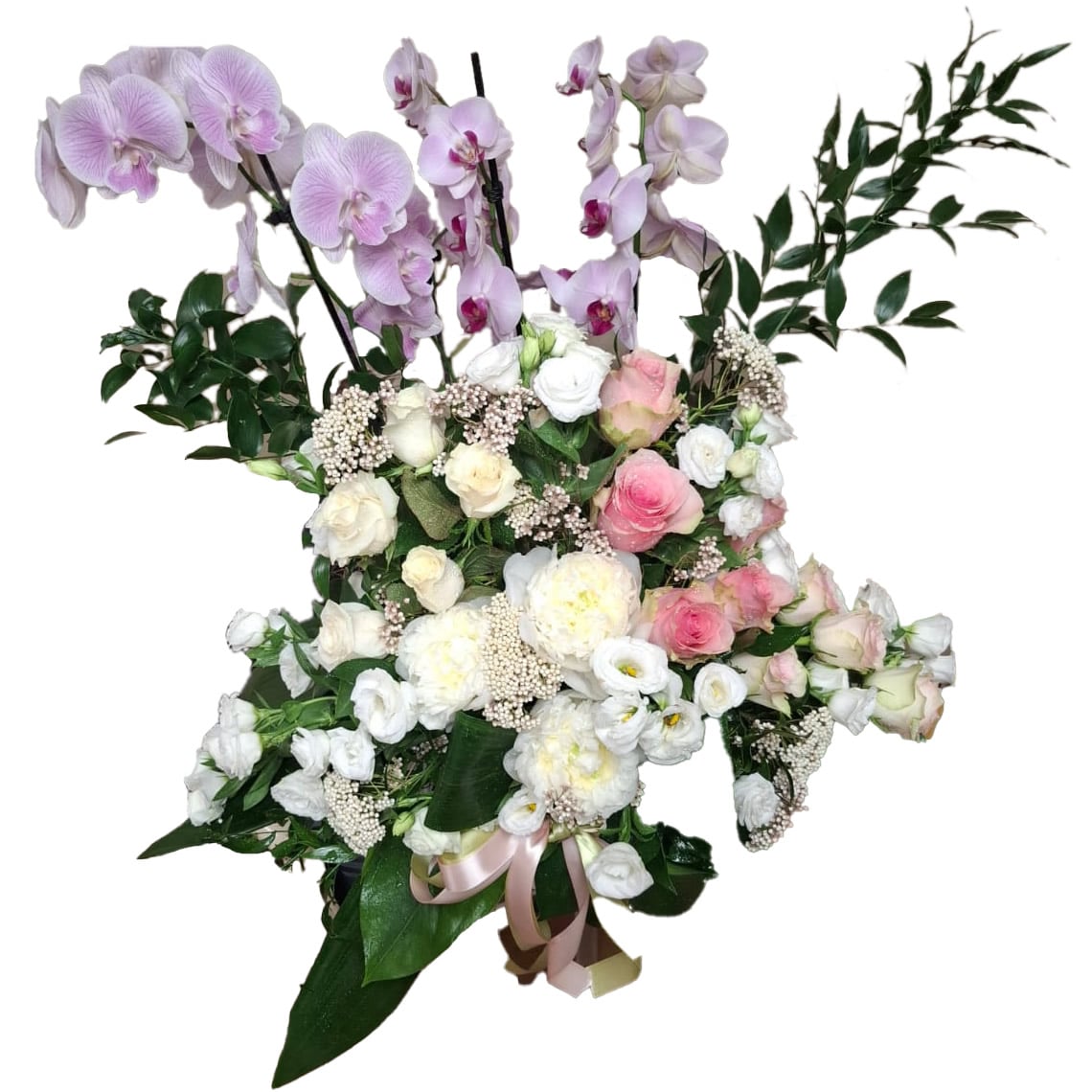 Splendida composizione in ceramica con Orchidee Phalaenopsis e Fiori misti